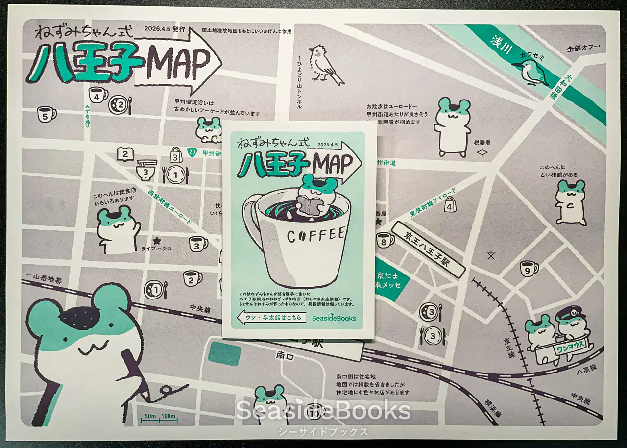 2026/4/5(日)開催のイベント 第12回TAMAコミ 新刊で、TAMAコミ会場(八王子)限定の折本・地図『ねずみちゃん式 八王子MAP』を発表します。